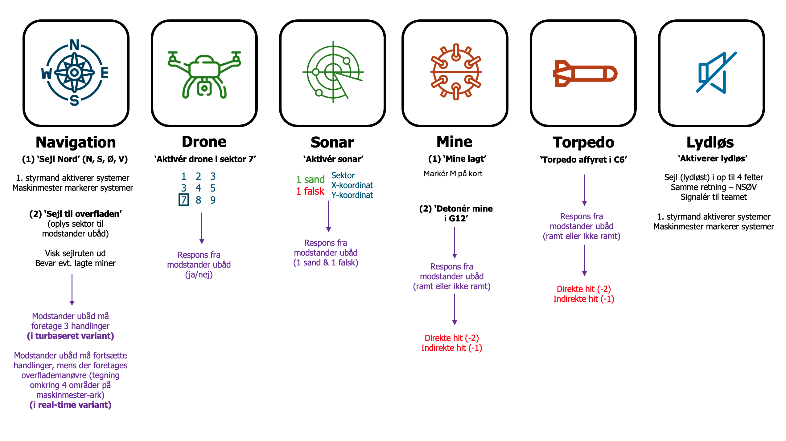 "Nord", "Syd", "Øst", "Vest", "Surface/overflade i sektor C", "Affyr torpedo mod B6", "Læg mine", "Detonér minen ved E5", "Aktivér Drone – er I i sektor B?", "Aktivér Sonar", "Lydløs".